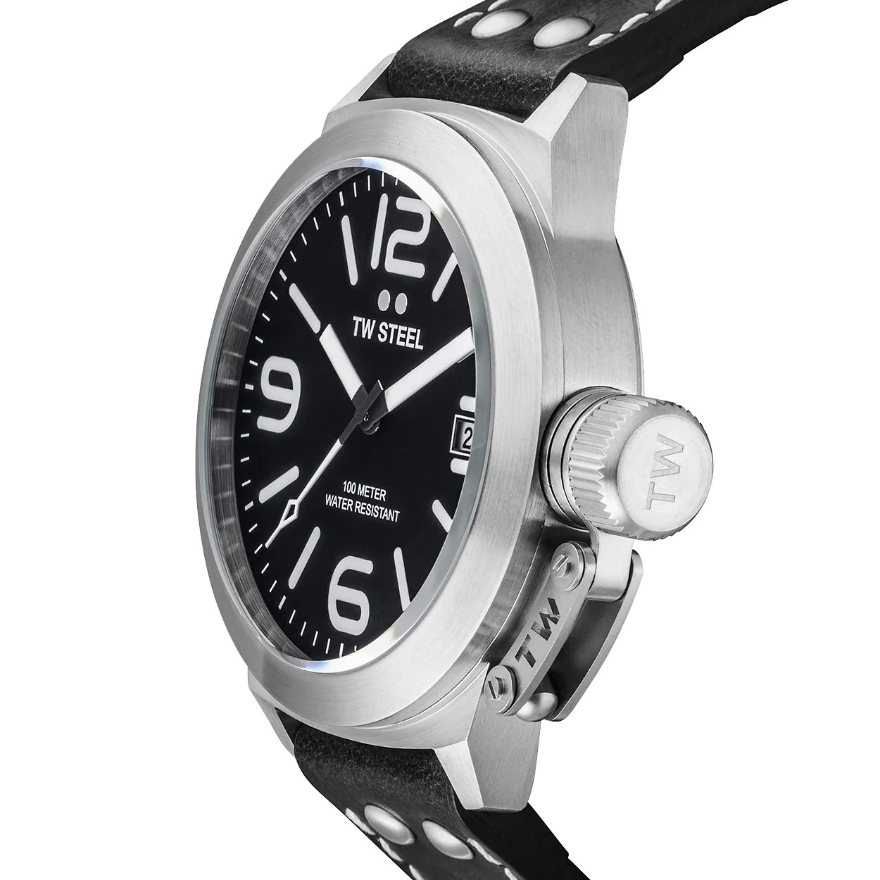 A bold vintage leather strap adorns this striking Canteen Style model. Additional features include brushed steel case and black dial.