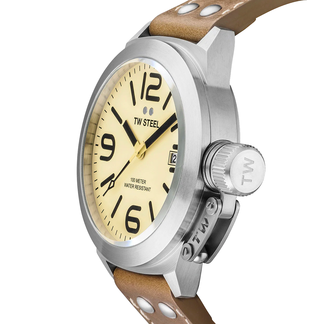 A bold vintage leather strap adorns this striking Canteen Style model. Additional features include brushed steel case and cream dial.