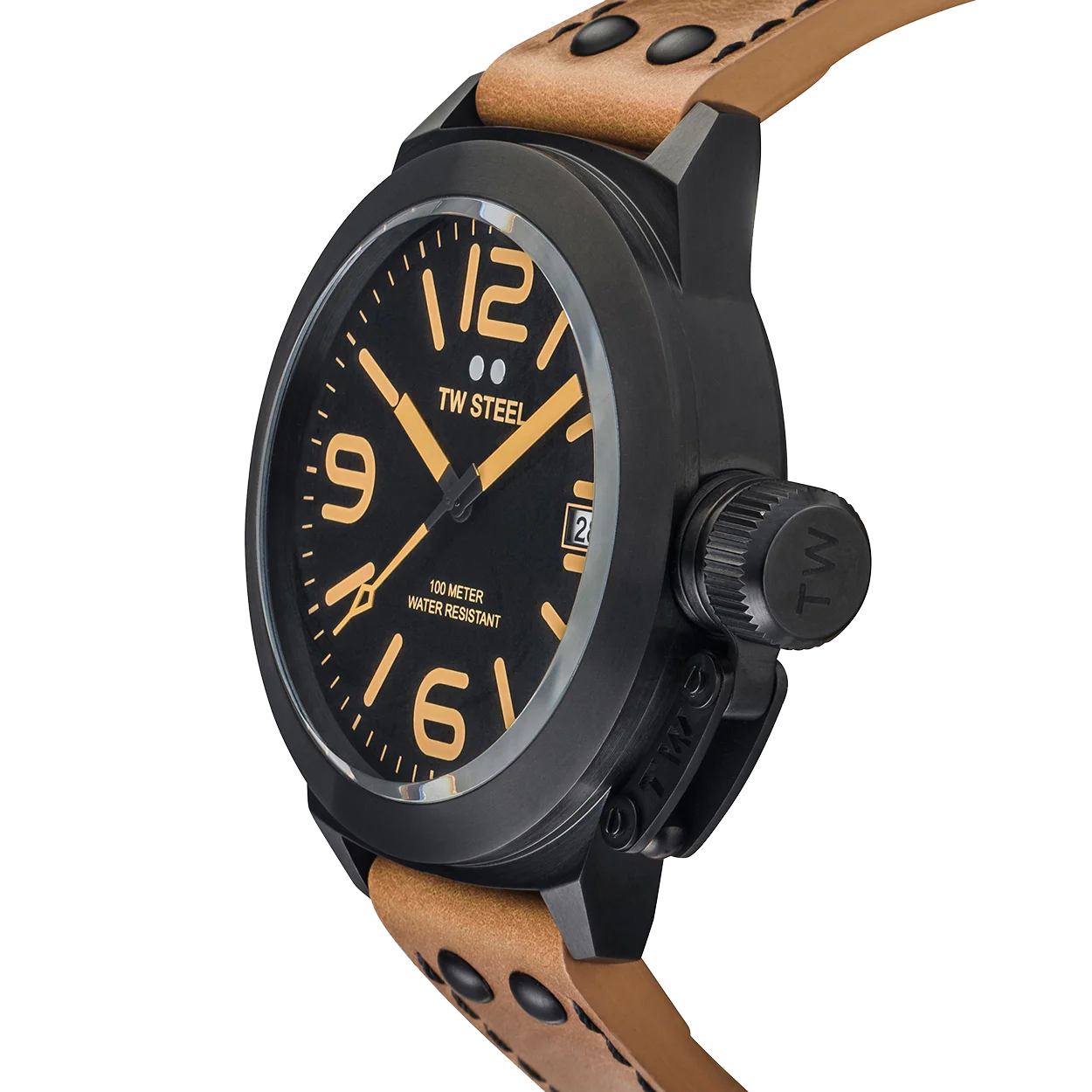 A bold vintage leather strap adorns this striking Canteen Style model. Features include PVD black coated brushed steel case and black dial.