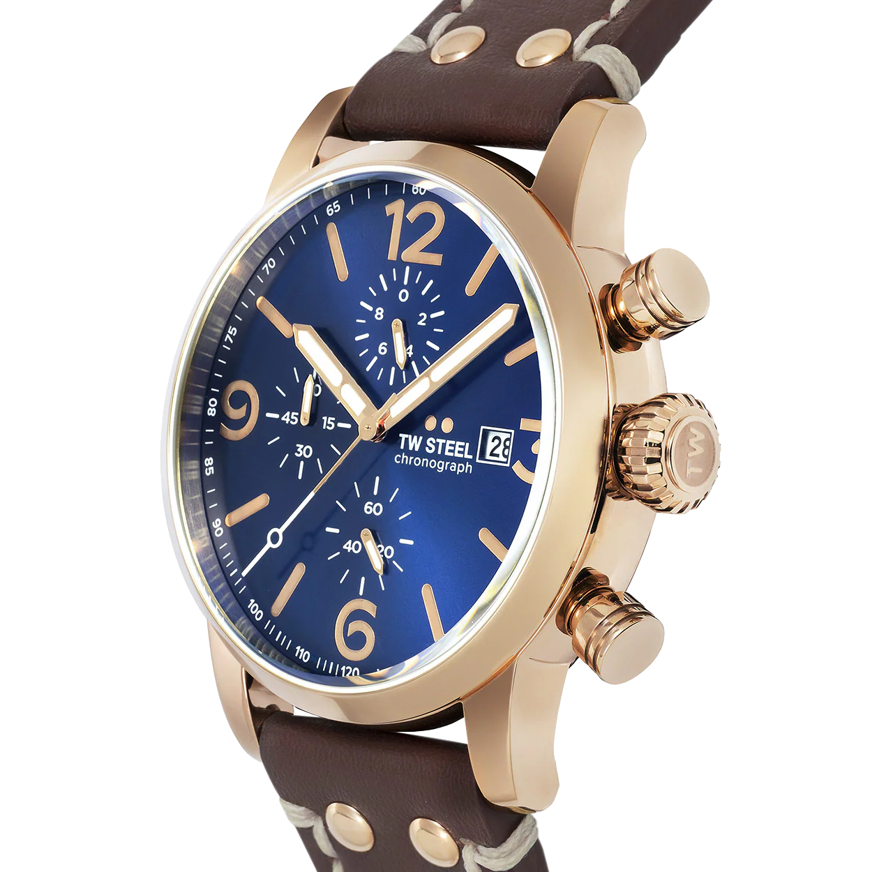 Take a modern twist on vintage style. This new Maverick features a big caliber chronograph movement, a dark blue sunray dial and a dark brown leather strap.