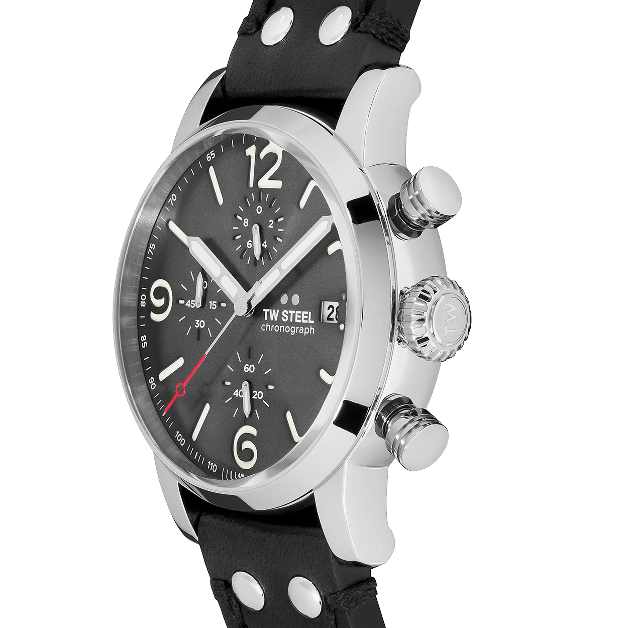 Take a modern twist on vintage style. This new Maverick features a big caliber chronograph movement, a grey sunray sandwich dial and an interchangeable black leather strap.