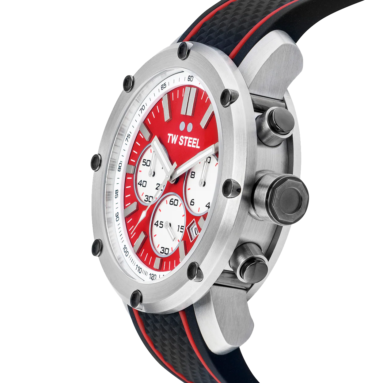 A perfect fusion of masculine and industrial-inspired styling. This Grandeur Tech features a red dial and a black silicon strap with red lines.