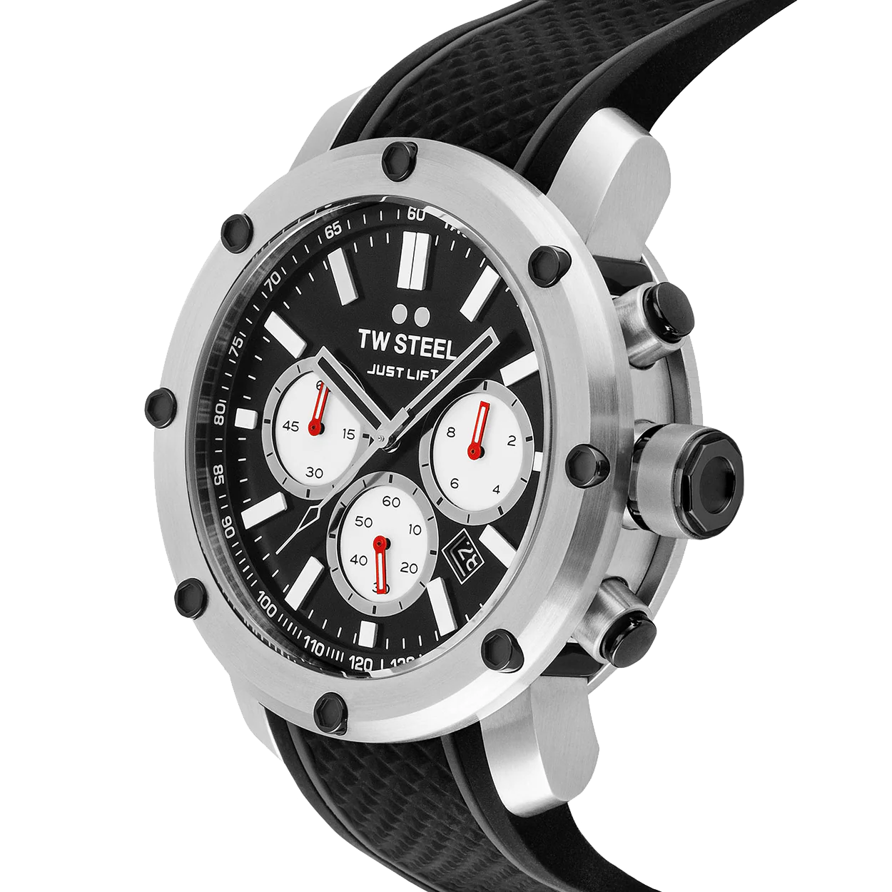 It’s Crunch Time; seize the moment! Designed together with fitness legend Simeon Panda, this Limited Edition timepiece is powered by a big caliber chronograph and features a Reverse Panda dial, a 48mm steel case, a black silicon strap with dark grey line and the ‘Just Lift’ logo on the loop and two year worldwide warranty.