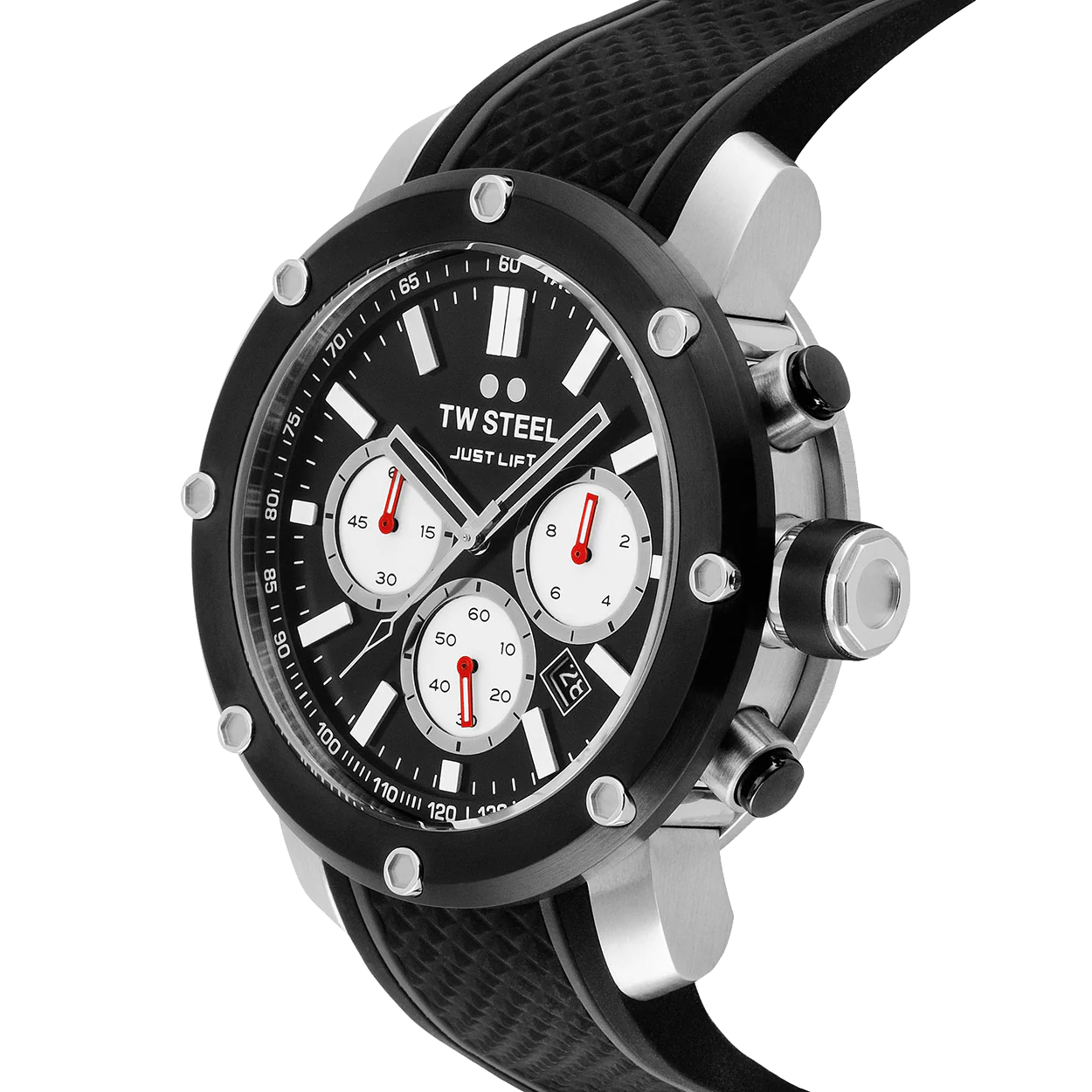 It’s Crunch Time; seize the moment! Designed together with fitness legend Simeon Panda, this Limited Edition timepiece is powered by a big caliber chronograph and features a Reverse Panda dial, a 48mm steel case, a black silicon strap with dark grey line and the ‘Just Lift’ logo on the loop and two year worldwide warranty.