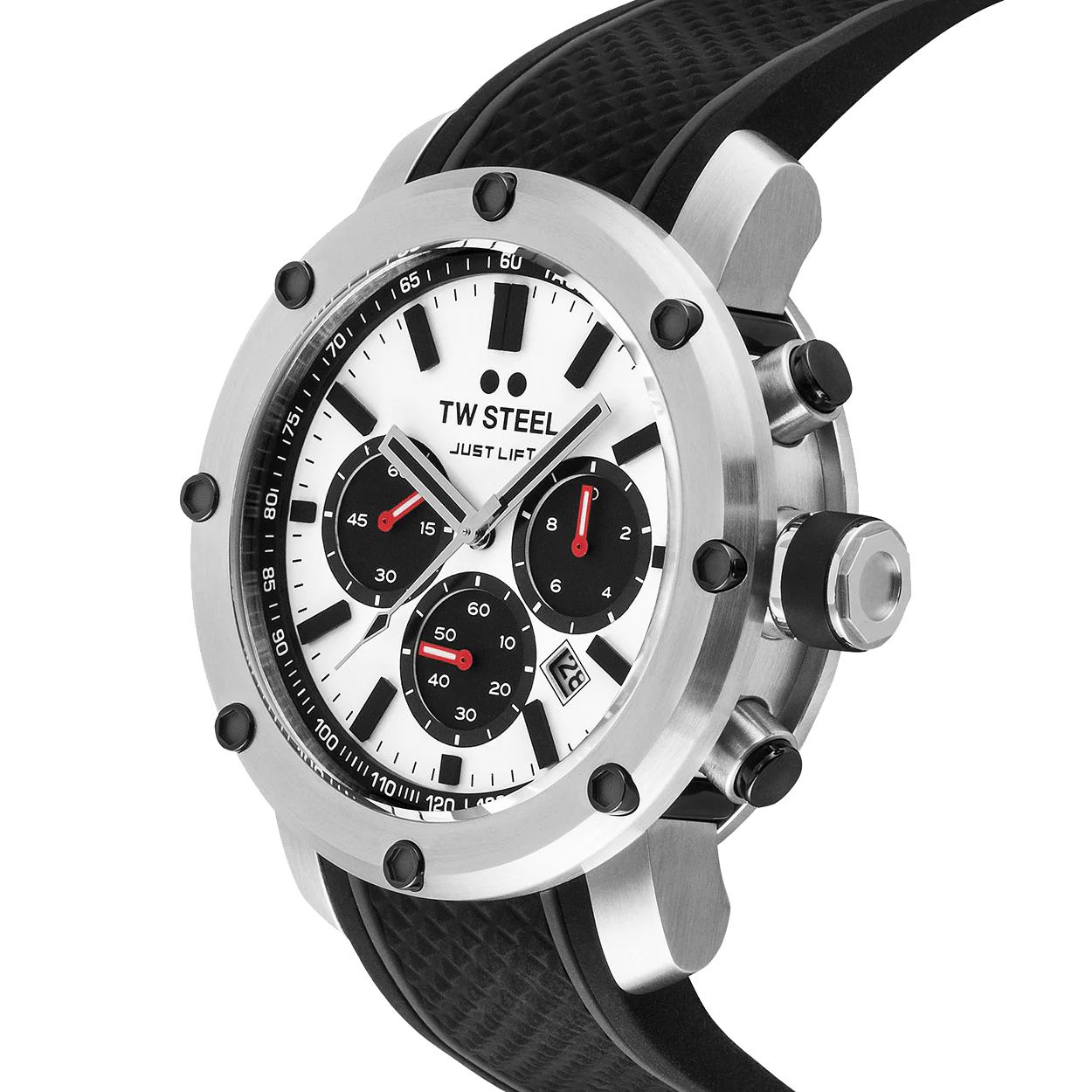 It’s Crunch Time; seize the moment! Designed together with fitness legend Simeon Panda, this Limited Edition timepiece is powered by a big caliber chronograph and features a Panda dial, a 48mm steel case, a black silicon strap with dark grey line and the ‘Just Lift’ logo on the loop and two year worldwide warranty.
