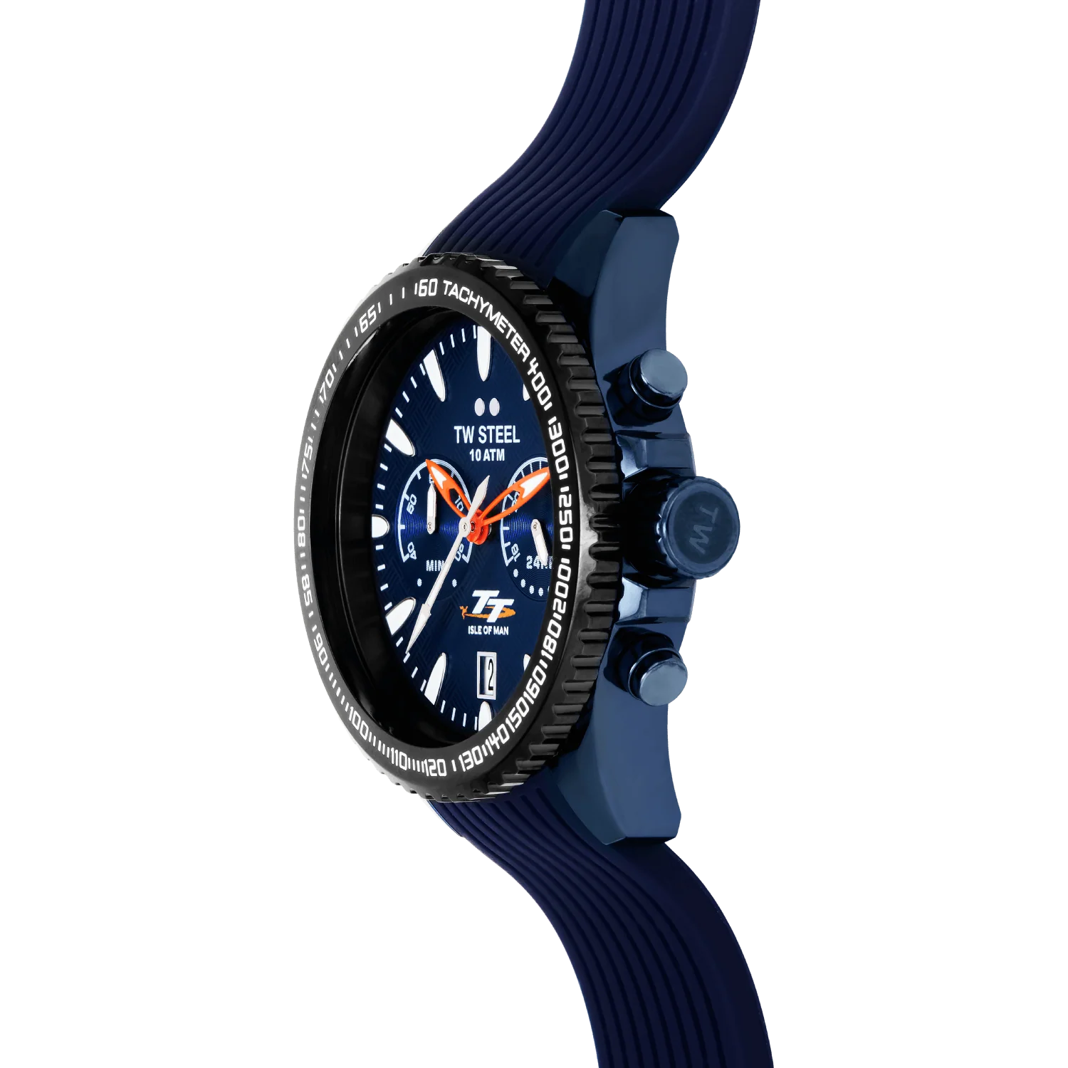 Precision in motion. The official TT Isle of Man edition comes in a 42mm blue case with black tachymeter bezel, luminous hands, and a blue silicone strap with folded clasp.