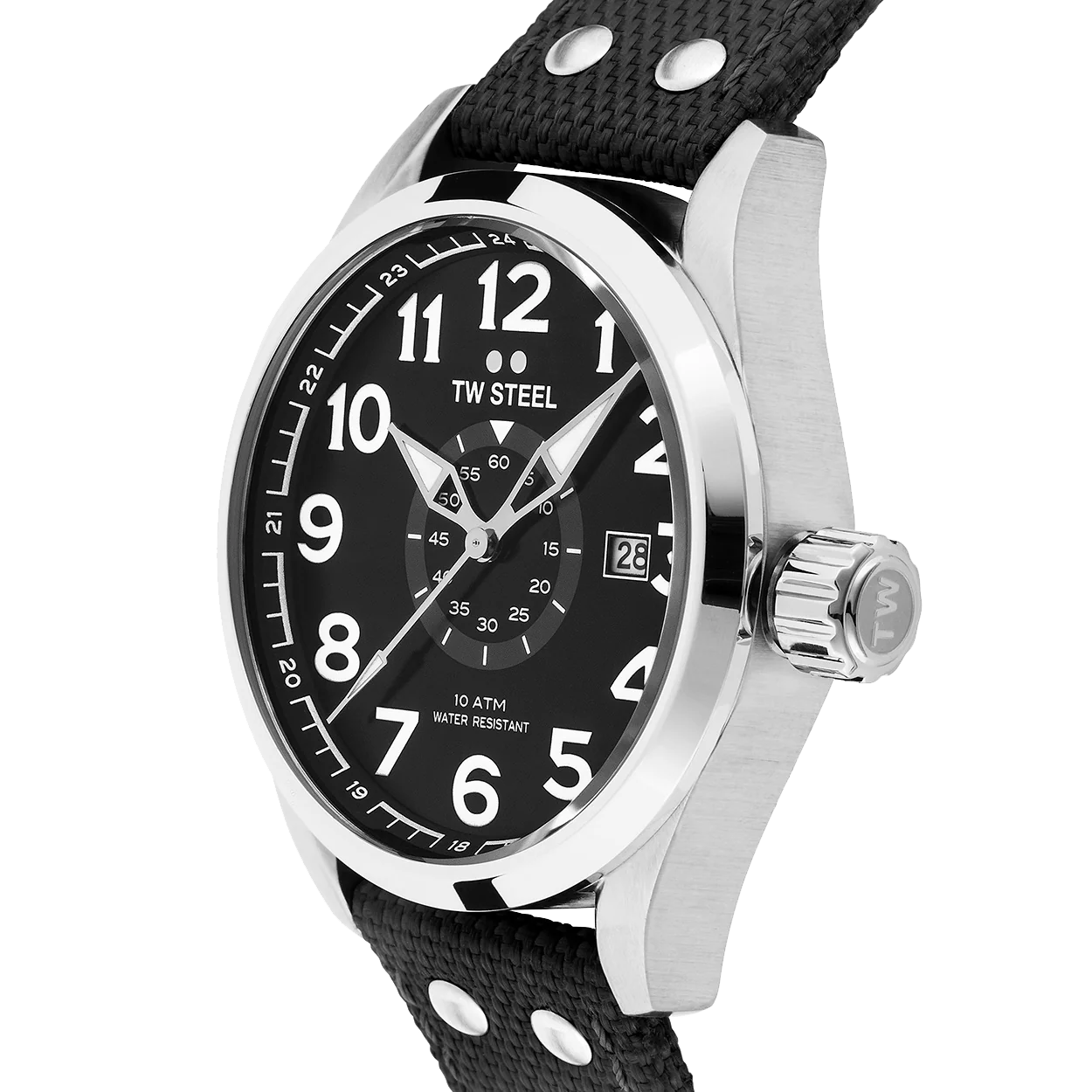 - Black textile strap with steel clasp
