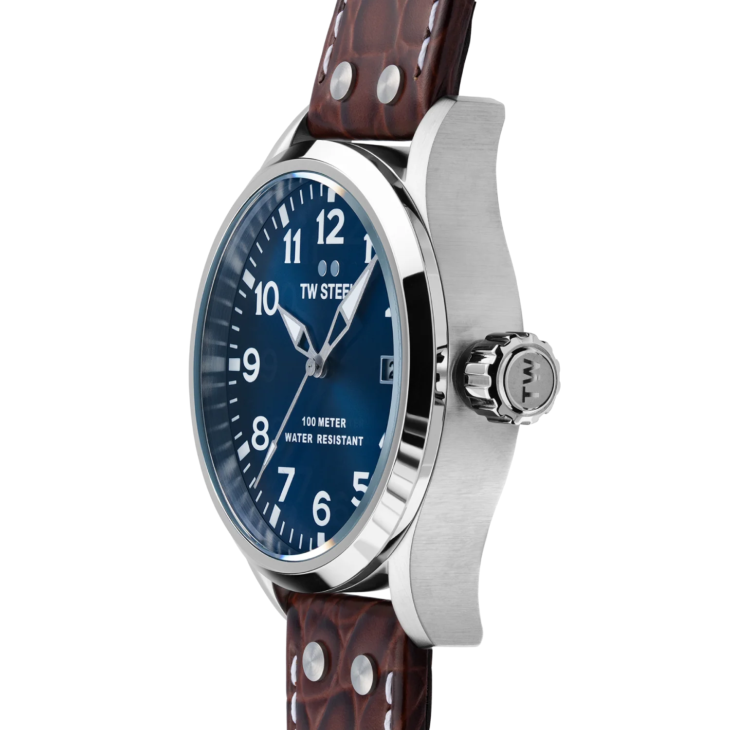 Go from A to Bold with this Volante watch. This VS101 features a 45mm steel case, a dark blue sunray dial and a brown croco leather strap.