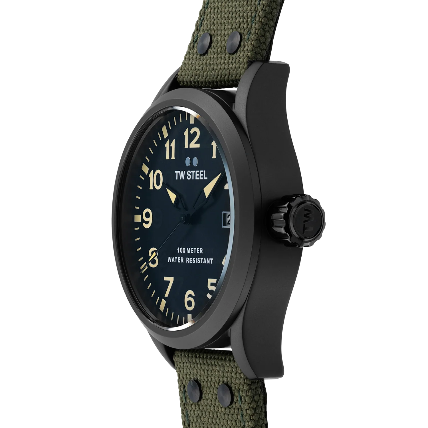 Go from A to Bold with this Volante watch. This VS102 features a 45mm black sandblasted case, a dark grey sunray dial and a dark green canvas on leather strap.