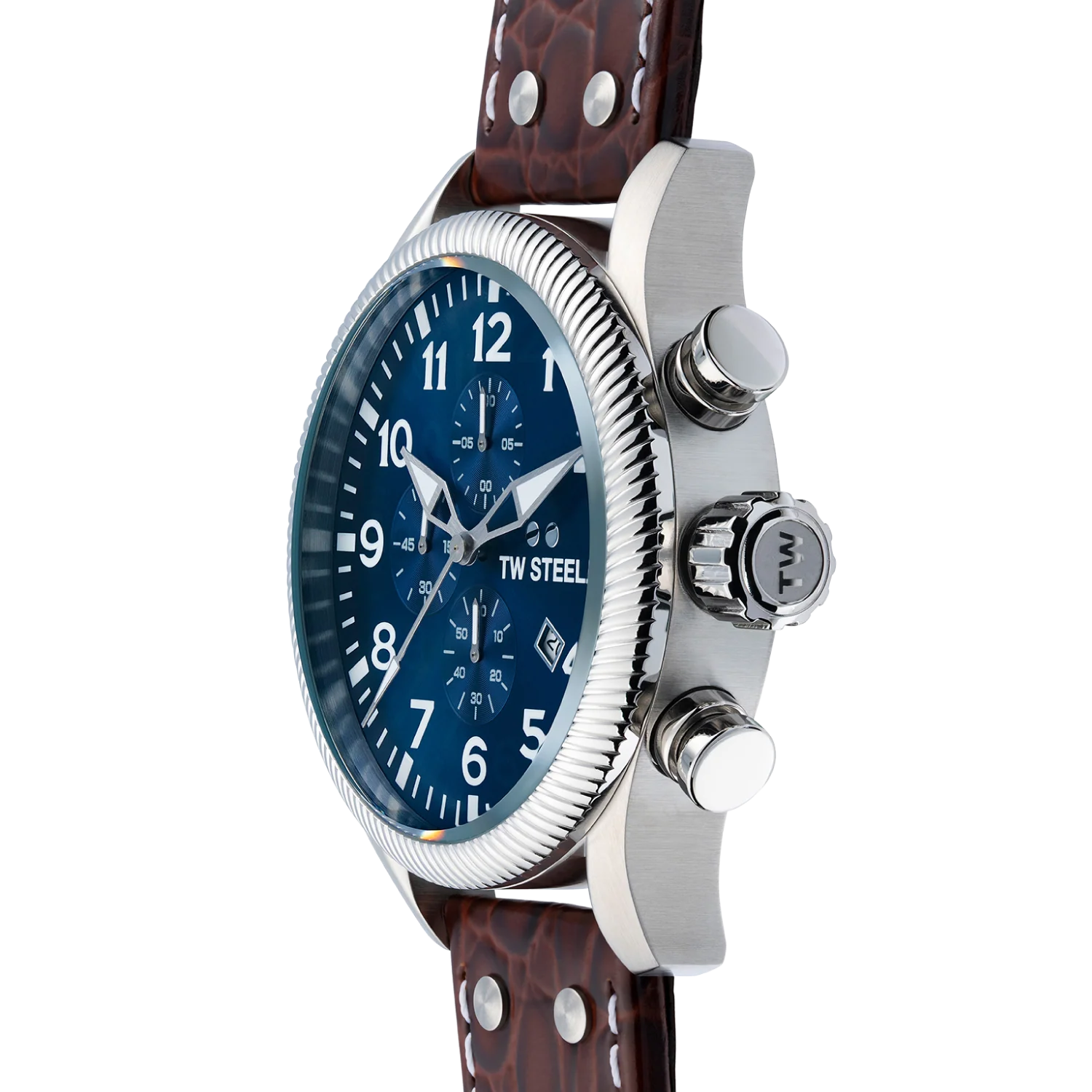 Go from A to Bold with this Volante watch. This VS111 is powered by a chronograph movement and features a 48mm steel case, a dark blue sunray dial and a brown croco leather strap.
