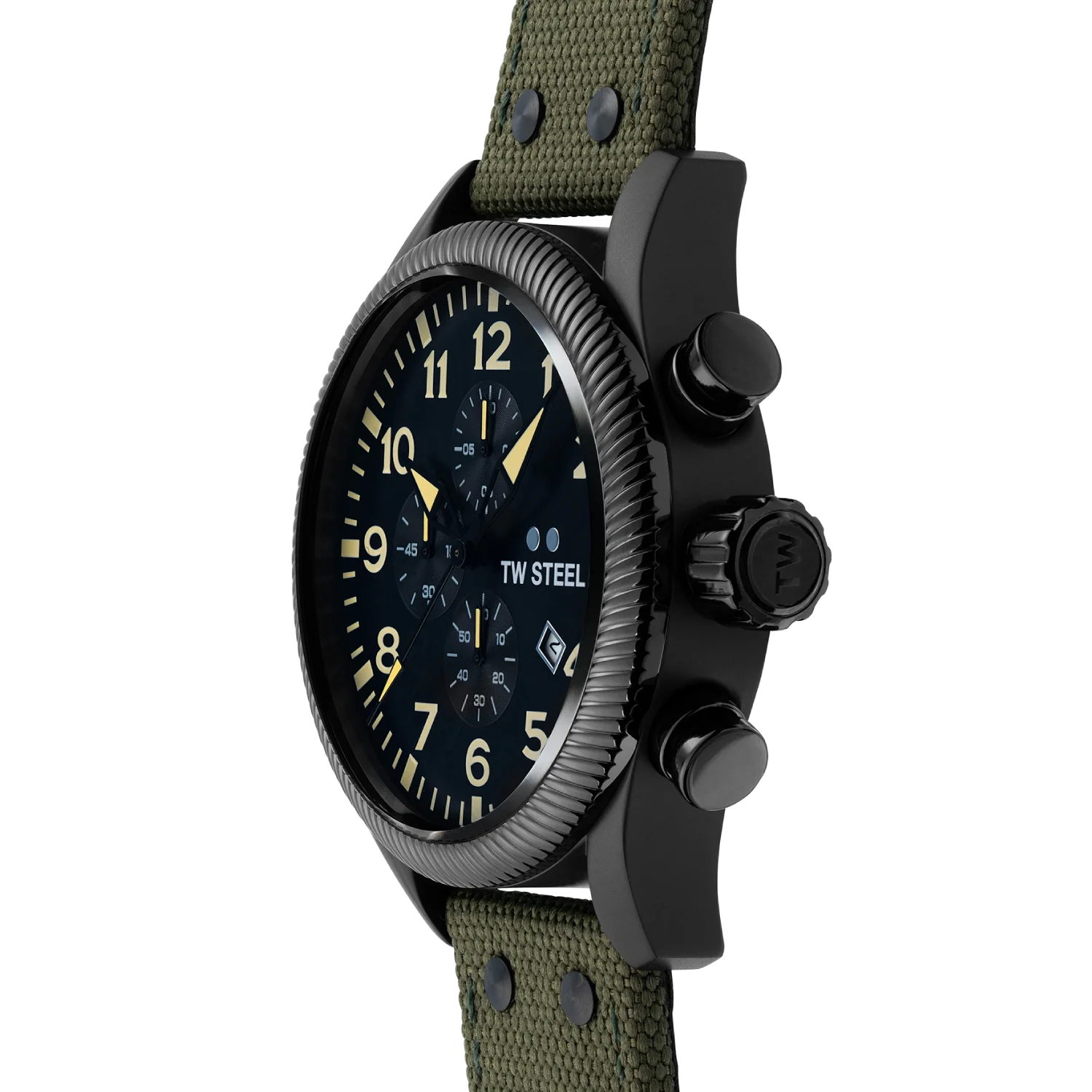 Go from A to Bold with this Volante watch. This VS112 is powered by a chronograph movement and features a 48mm black sandblasted case, a dark grey sunray dial and a dark green canvas on leather strap.