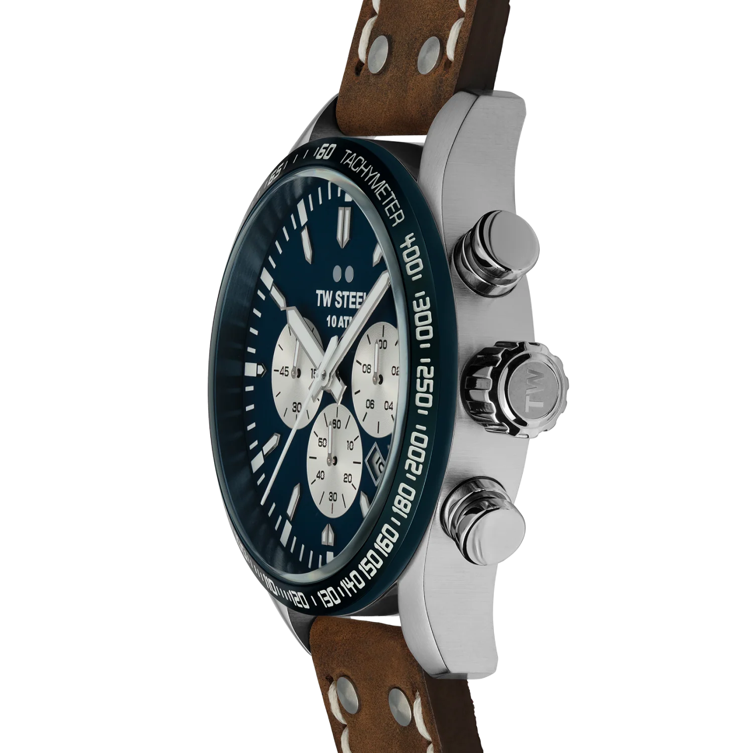 Go from A to Bold with this Volante watch. This VS121 is powered by a chronograph movement and features a 48mm steel case, a dark blue satin dial and a brown leather strap.