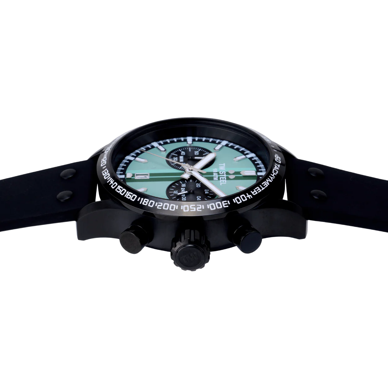The new VS134 brings fresh energy to the Volante Sport collection. Featuring a mint green chronograph dial with racy striping, black case, tachymeter bezel, and black rubber strap, this 45mm watch combines bold attitude, precision, and everyday performance with unmistakable TW Steel confidence.