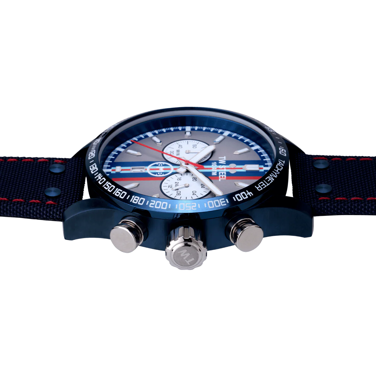 The TW Steel × Van den Brink RallySport Special Edition fuses rally heritage with wrist performance. Featuring a grey chronograph dial with bold racing stripes, a 48 mm blue PVD coated 316L case, tachymeter bezel and textile and leather strap with red stitching, this watch embodies Dutch endurance, precision and fearless style inspired by Van den Brink RallySport.
