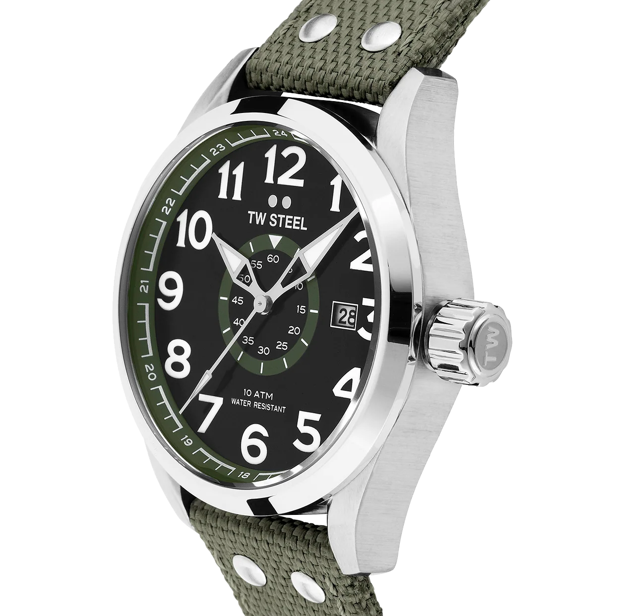 - Black dial with army green details